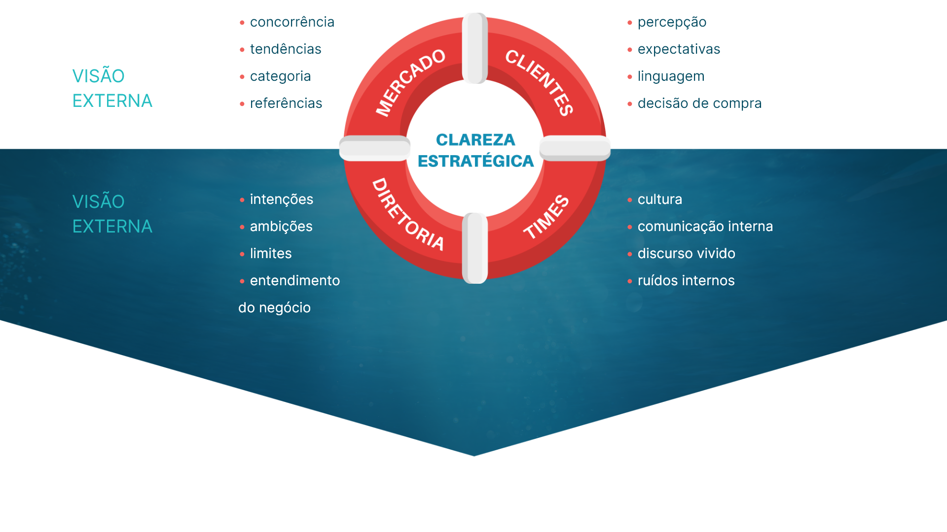 Leitura da visão e conhecimento do negócio, ambições, limites e direcionadores, alinhandomarca e estratégia empresarial.